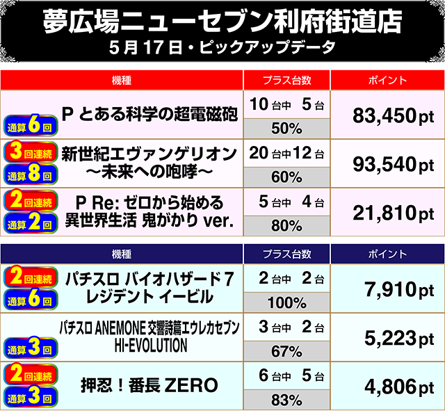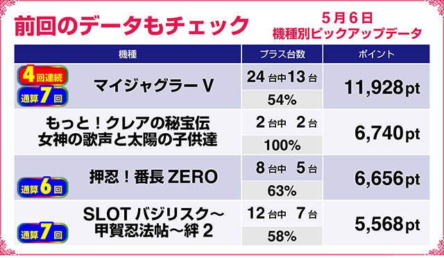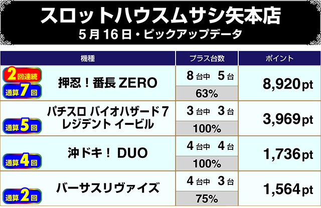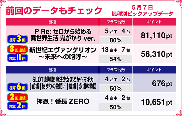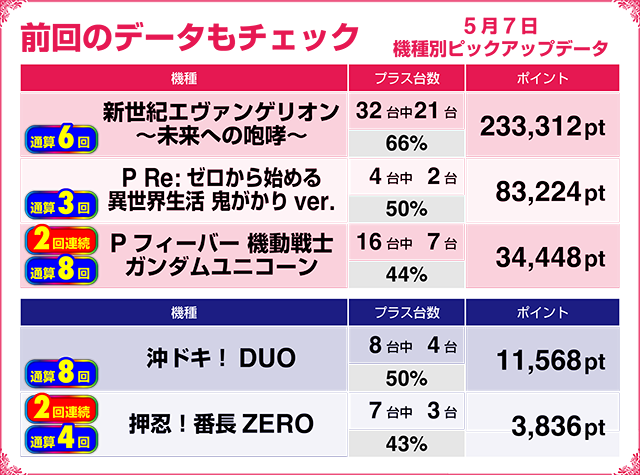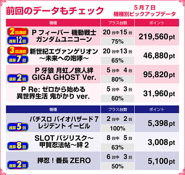 2台がともにプラスの『パチスロ バイオハザード7 レジデント イービル』や6台中5台がプラスの『押忍!番長ZERO』も2回連続でのピックアップ選出となった。