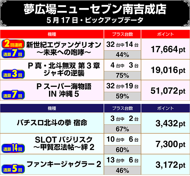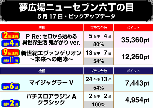 パチスロでは、『パチスロアラジンAクラシック』が全台プラス。設置台数が多い『マイジャグラーV』は5割以上がプラスであった。