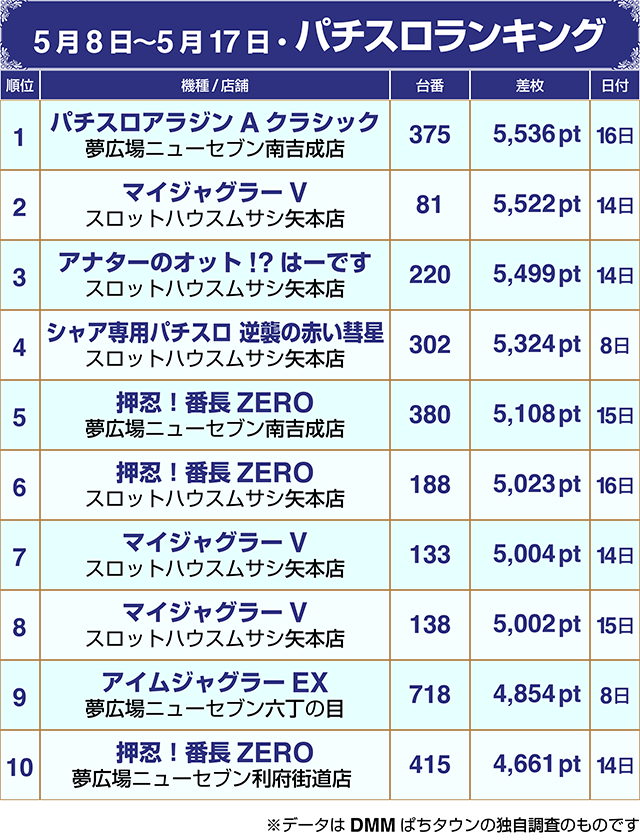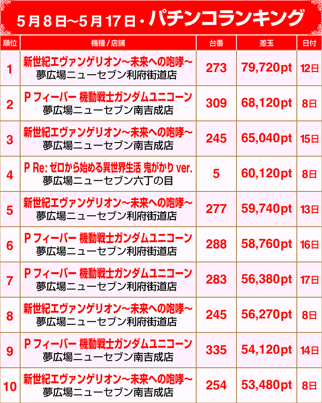 【パチンコ5月8日~5月17日ランキング】