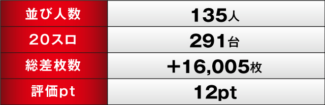 終わってみれば、優秀台、ピックアップ機種を中心に、全体的に稼働も良く、トータルの差枚は+16,005枚を記録。評価ptも12ptを獲得した。今後、さらなる注目を集める存在としての活躍が期待されるところだ。