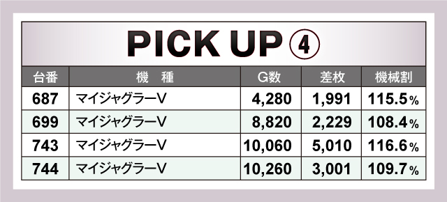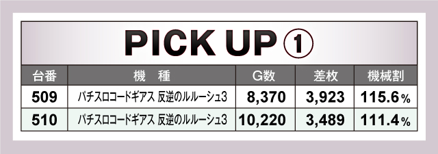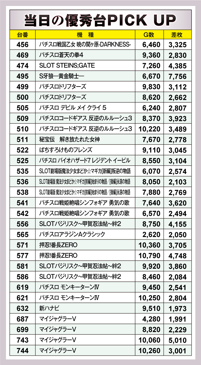 優秀台を見てみると、なんといっても、+7,756枚をマークした『S牙狼―黄金騎士―』の495番台の活躍が目立っていた。あらためて、機種のポテンシャルの高さを感じさせた。それに続いたのが+5,010枚の『マイジャグラーⅤ』743番台。同台はG数も10,960Gを記録しており、稼働の良さがそのまま出玉につながった印象だ。以下、+4,748枚の『押忍!番長ZERO』577番台と+3,705枚の同571番台、+4,385枚の『SLOT STEINS;GATE』474番台、+4,155枚の『SLOTバジリスク〜甲賀忍法帖〜絆2』556番台と+3,860枚の同581番台、+3,923枚の『パチスロコードギアス 反逆のルルーシュ3』509番台、+3,620枚の『パチスロ戦姫絶唱シンフォギア 勇気の歌』541番台と続いた。