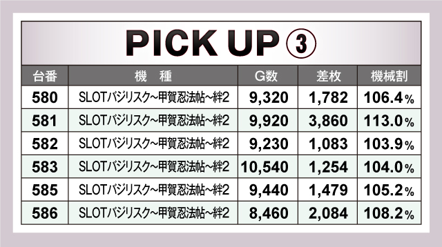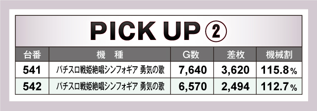 ピックアップ機種では、『パチスロコードギアス 反逆のルルーシュ3』、『パチスロ戦姫絶唱シンフォギア 勇気の歌』、『SLOTバジリスク〜甲賀忍法帖〜絆2』、『マイジャグラーⅤ』が盛り上がりを見せていた。