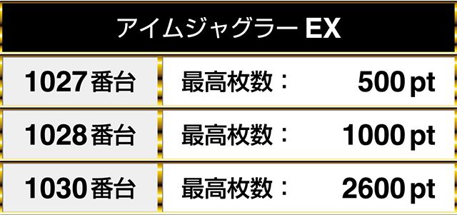 1日を通したデータをみると、2600ptがあった『アイムジャグラーEX』は3台が並んでプラスpt!!