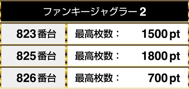 『ファンキージャグラー2』も3台が連なってプラスptとなり、2台が1000ptを上回った。