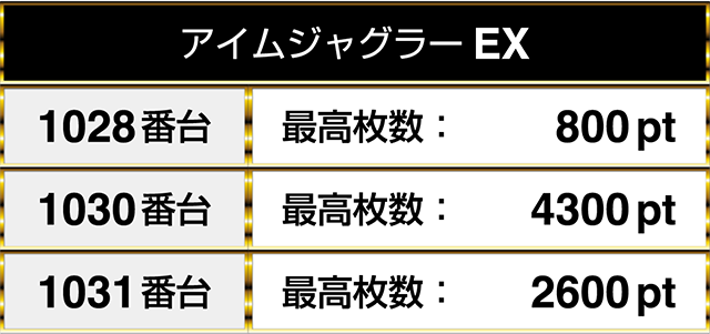 最終的には3台が並んでプラスptとなり、2600ptや4300ptを記録する台もあった。