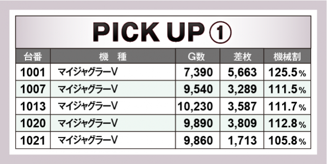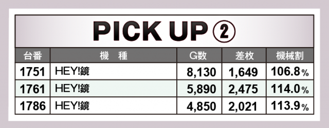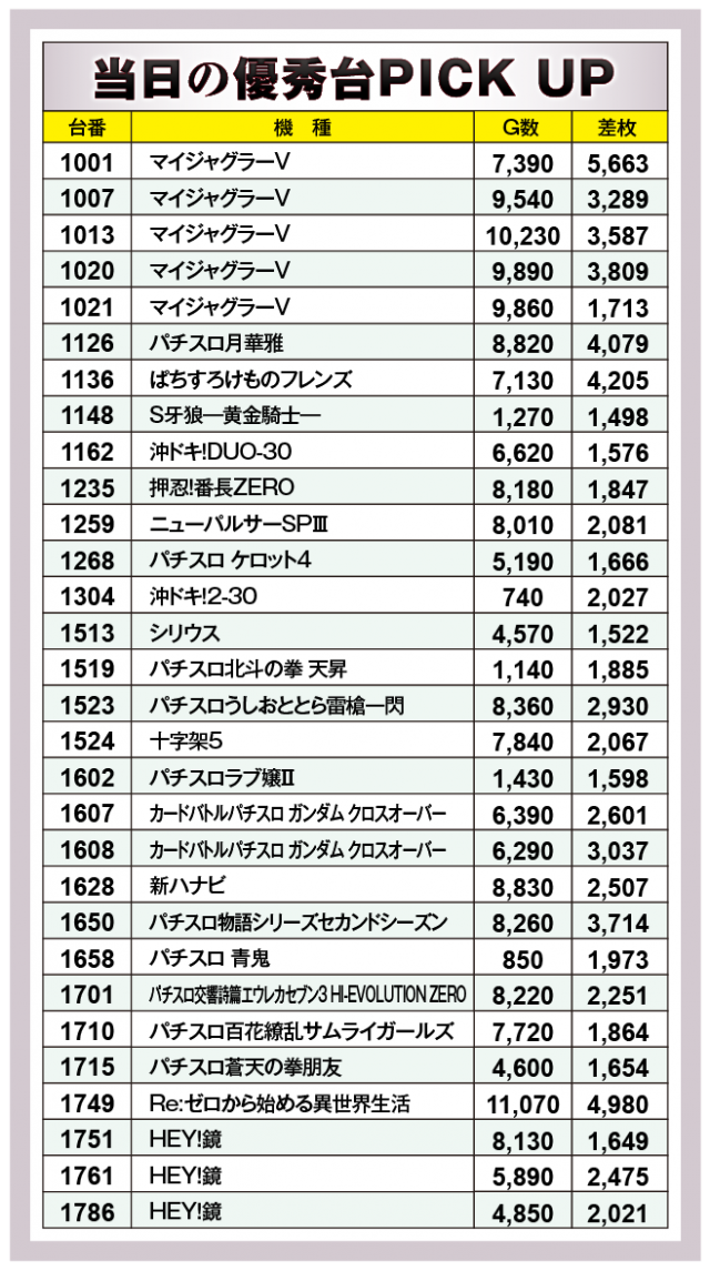 ピックアップ機種では、前述で紹介したトップ差枚機種『マイジャグラーⅤ』が高稼働・大量出玉を見せたのを筆頭に、『HEY!鏡』が盛り上がりを見せていた。