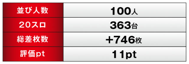 今回、[21.72]スロ全台トータルの差枚数は+746枚、評価ptが11ptと辛勝ながら、見事5連勝を果たした。同店は「英雄」取材がハイペースで実施されており、こういう場面があることは理解したい。その中で結果として勝利していることは素晴らしいの一言である。次回では連勝はもちろんのこと、更なる高得点の獲得にも期待したい!
