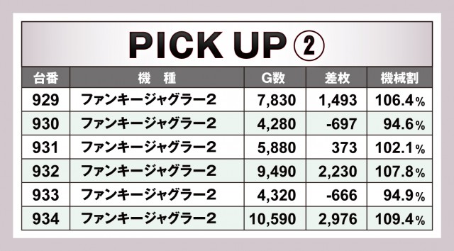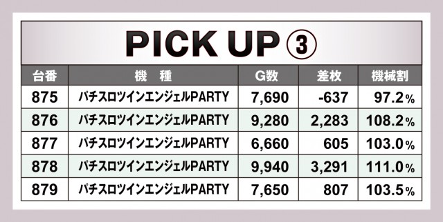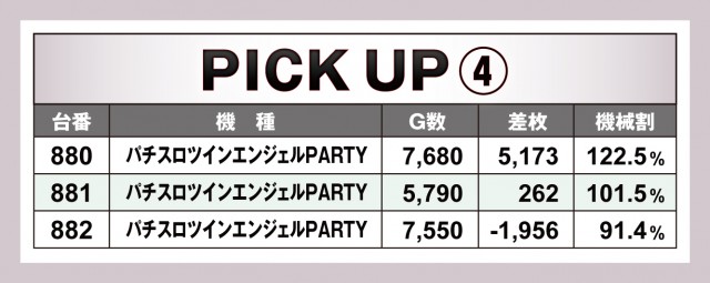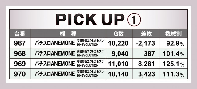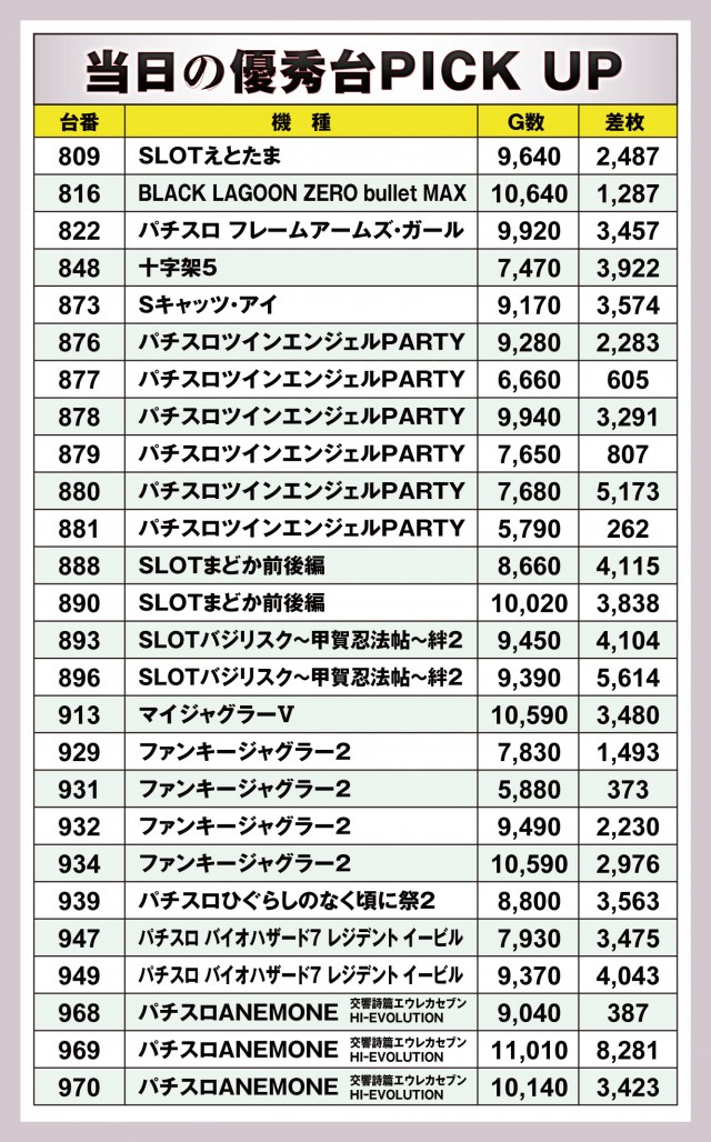 今回のピックアップは4つ。『パチスロANEMONE 交響詩篇エウレカセブン HI-EVOLUTION』や『パチスロツインエンジェルPARTY』は差枚数的にマイナスの台もあったが、サミートロフィーなどの設定示唆演出が出たのであろうか。全台系を匂わすような稼働量であった。なお、969番台からは+8000枚オーバーが炸裂! この日のトップ差枚数となった。