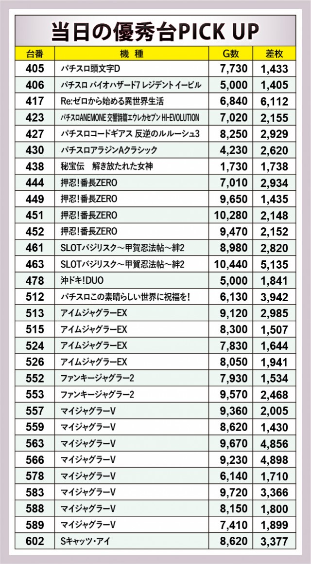 上表をご覧の通り、『ジャグラー』シリーズの活躍が目立っていたのが印象的だ。先陣に立っていたのは『マイジャグラーV』で、5千枚近いプラスを記録していることに好感を覚えずにはいられない。他にも『Re:ゼロから始める異世界生活』417番台+6,112枚や『SLOTバジリスク~甲賀忍法帖~絆2』463番台+5,135枚といった数字も見られ、各所で凄まじい熱気が放たれていたのが窺える。