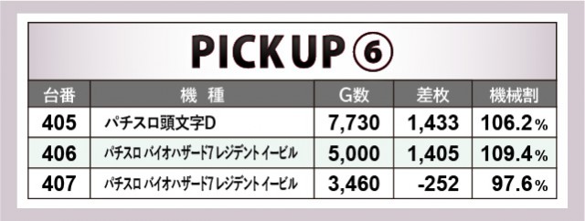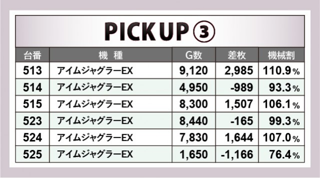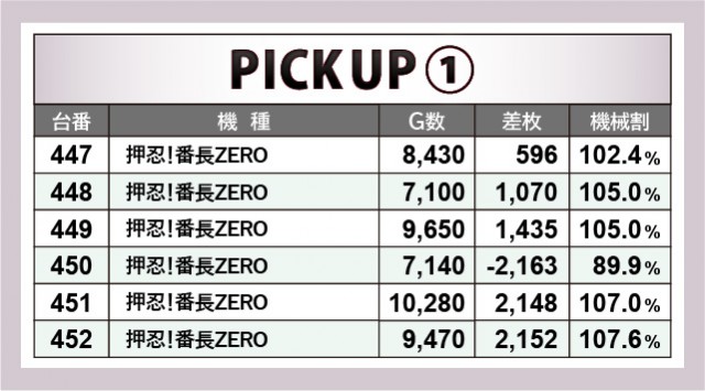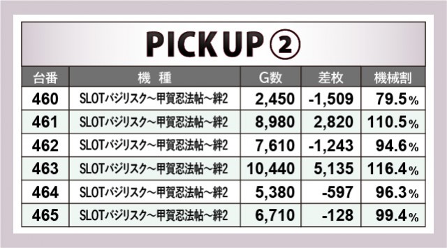 『押忍!番長ZERO』『SLOTバジリスク~甲賀忍法帖~絆2』では、6台の横並びの好況スポットが形成されていた。全台プラス差枚とはならずとも、各台でしっかりと熱気を放っており、ファンにとって打ちごたえのある状況だったのは確かだ。その中で生まれた『SLOTバジリスク~甲賀忍法帖~絆2』463番台+5,135枚という記録は、お見事と手放しで称賛したい結果である。