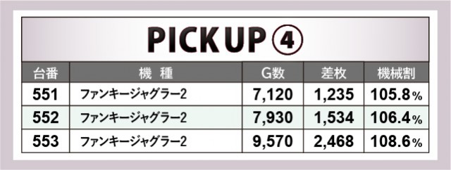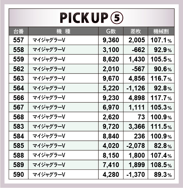 現行の『ジャグラー』シリーズは、いずれも安定的な結果を残したと言える。やはり人気筆頭の『マイジャグラーV』は回転数・差枚数ともに大きく、以下に高い支持を集めているのかが分かるだろう。『アイムジャグラーEX』『ファンキージャグラー2』も負けじと奮闘し、3千枚近い差枚数を記録している点には、好感を覚えずにはいられない。