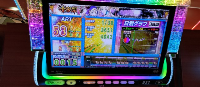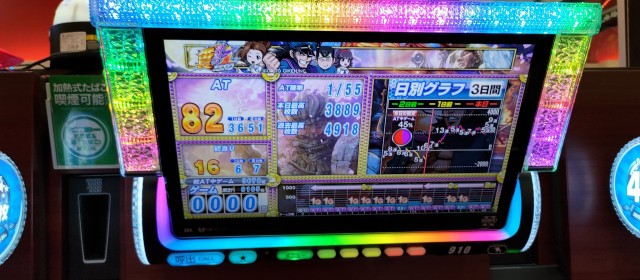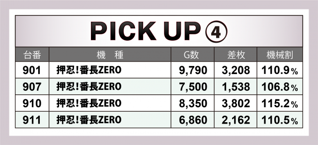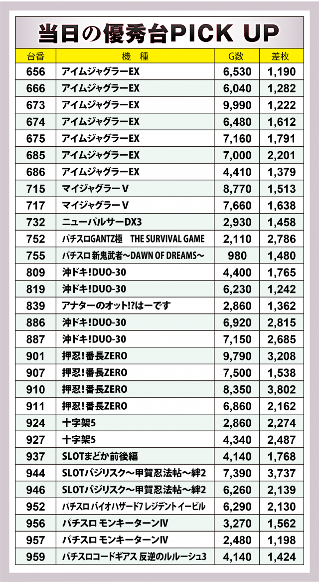 またこの日は前回の「英雄」取材時にも好調台が多かった3機種が今回も続いてハイスコアを連発。特に増台を果たした『押忍!番長ZERO』は+3千枚突破が2台&4台の合計は+1万枚オーバーに。また同店最多設置の『アイムジャグラーEX』には4ケタ台の差枚数が9台、『沖ドキ!DUO-30』は5台のトータルが+1万枚超を達成!