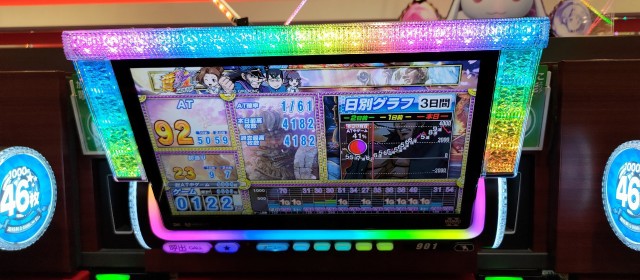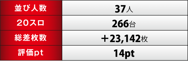 今回の[1000円/46枚] スロ計266台はトータル差枚数+23,142枚と前回のプラス枚数を大きく超えて連勝を果たし、評価ptも1伸ばす好成績に。これで2022年の成績は白星・黒星が半々ずつ、次回の取材時では勝ち星先行が見えてきた!