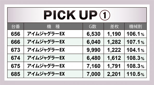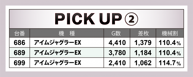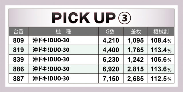 まずは優秀30台のPICK UPから。後述する好調3機種以外で差枚数が高かったのは、2台合計で+6千枚弱を残した『SLOTバジリスク~甲賀忍法帖~絆2』、また次いで2台のトータルが+5千枚弱となった『十字架5』、この2機種の成績が目立っていた。