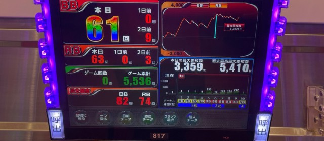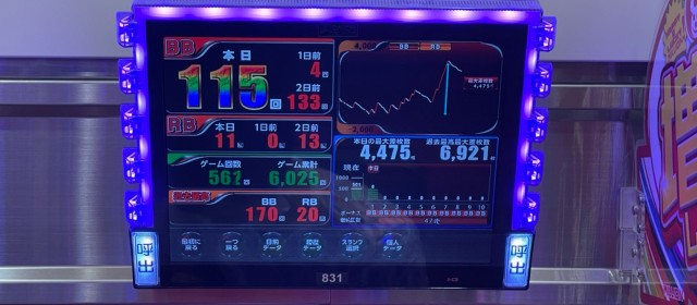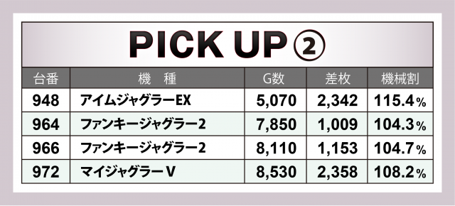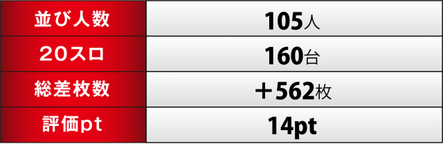 今回の20スロ計160台ではトータル差枚数+562枚と、ギリギリながらも前回に続きプラスとなり連勝を達成。また評価ptが伸び悩んでいる点もいささか気がかり。次回取材時はこの点を踏まえて圧倒的なプラス成績を成し遂げたい!