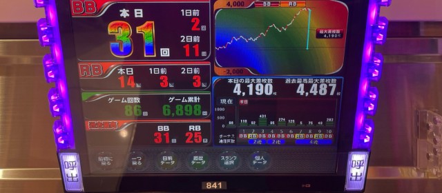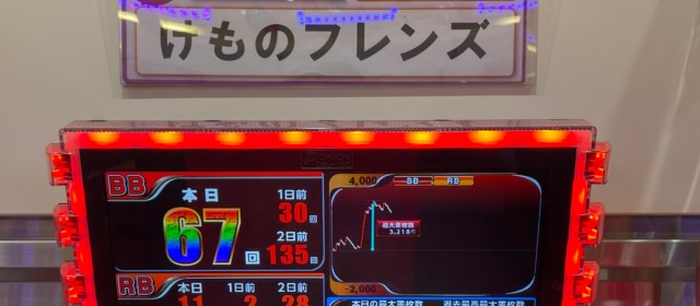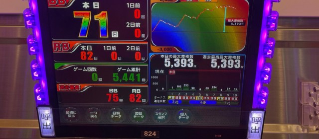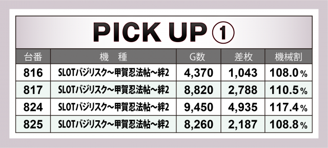 続いては当日好調だった『SLOTバジリスク~甲賀忍法帖~絆2』とジャグラーシリーズ3機種4台ずつをチェック。前者は+5千枚目前の台を筆頭に4台合計で+1万1千枚近くに。後者もボーナス回数70に迫る台が生まれるなど堅調な出玉を記録した。