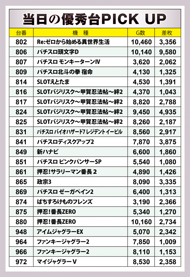 まずは差枚数優秀23台PICK UPから。後程解説する好調機種の他に当日好成績を残したのは、何と言っても『パチスロ頭文字D』。惜しくも万枚には届かなかったが+9千5百枚を突破! その他では+3千枚クラスとなった『Re:ゼロから始める異世界生活』『パチスロ バイオハザード7 レジデント イービル』『パチスロディスクアップ2』『政宗3』4機種のハイスコアが光った。