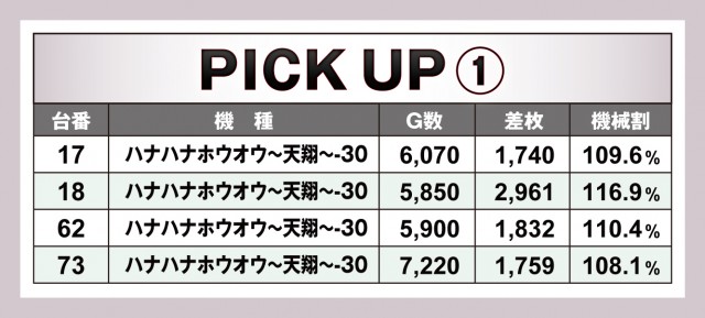 ピックアップは2つ。ハナハナはさきほどご紹介した通り。『押忍!番長ZERO』に関しては4台中2台が優秀台。いわゆる「ニブイチで高設定」ということなのだろうか。どちらも+3000枚弱の差枚数となった。