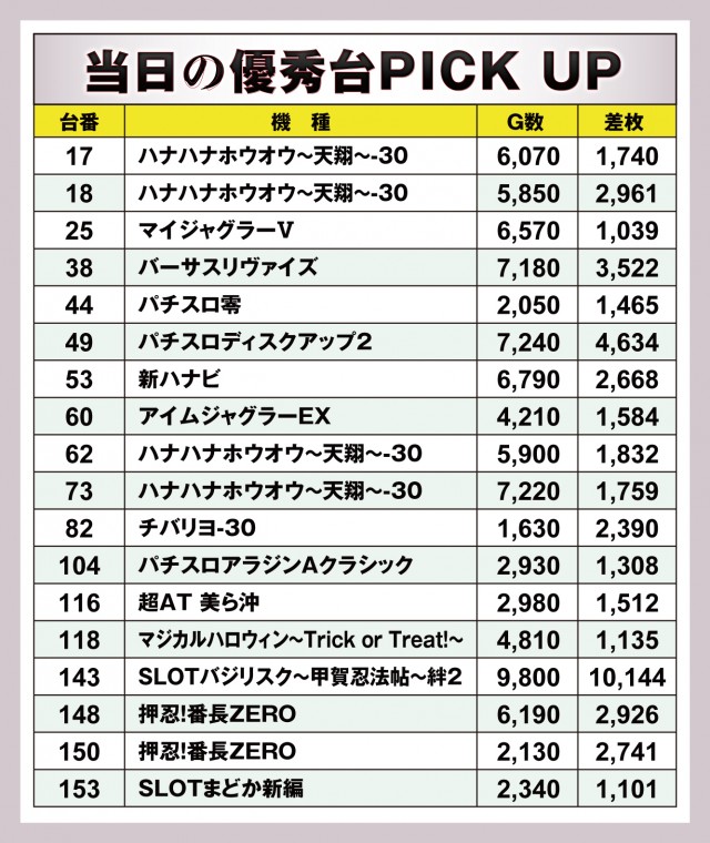 やはり地域柄と言えばいいのだろうか。沖スロの強い地域というだけあって、ノーマルタイプ=ジャグラーがこの『VEAM見附店』ならばノーマルタイプ=ハナハナになるのだろう。『ハナハナホウオウ~天翔~-30』から4台の優秀台を確認! そして、なんと言っても今回一番目立ったのは『SLOTバジリスク~甲賀忍法帖~絆2』の143番台から大台突破が成されたことだ。とんでもないヒキ強でも、さすがに低設定ではあそこまではいかない。やはり、設定あってこその大台ということなのだろう。
