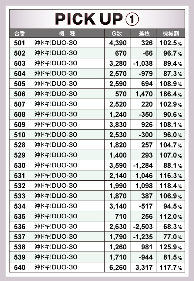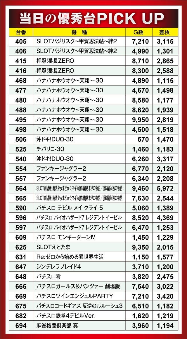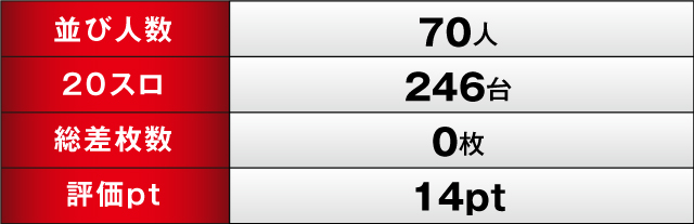 様々な機種が活躍したものの、この日の総差枚数はプラマイ0。評価ptも14ptで前回を超えられず、「アップ」降臨の1日にしては若干物足りない印象があった。次回こそは本ホールの真の実力を見せていただきたい!