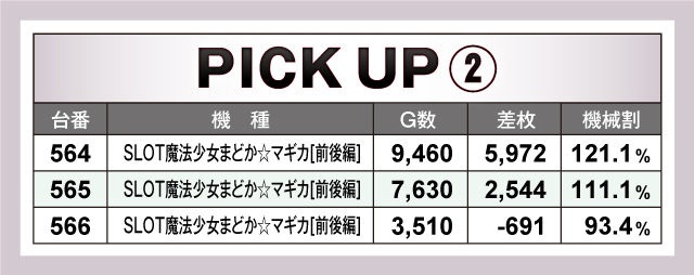 本ホールといえば『沖ドキ!DUO』となるほど、その力の入れ具合は凄まじく、半数以上がプラス終始となった。その他にも、『まどかマギカ前後編』や『バイオハザード7』、『新ハナビ』も目立つ活躍を見せていた。