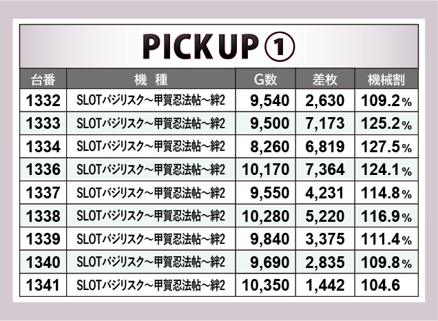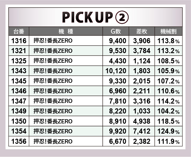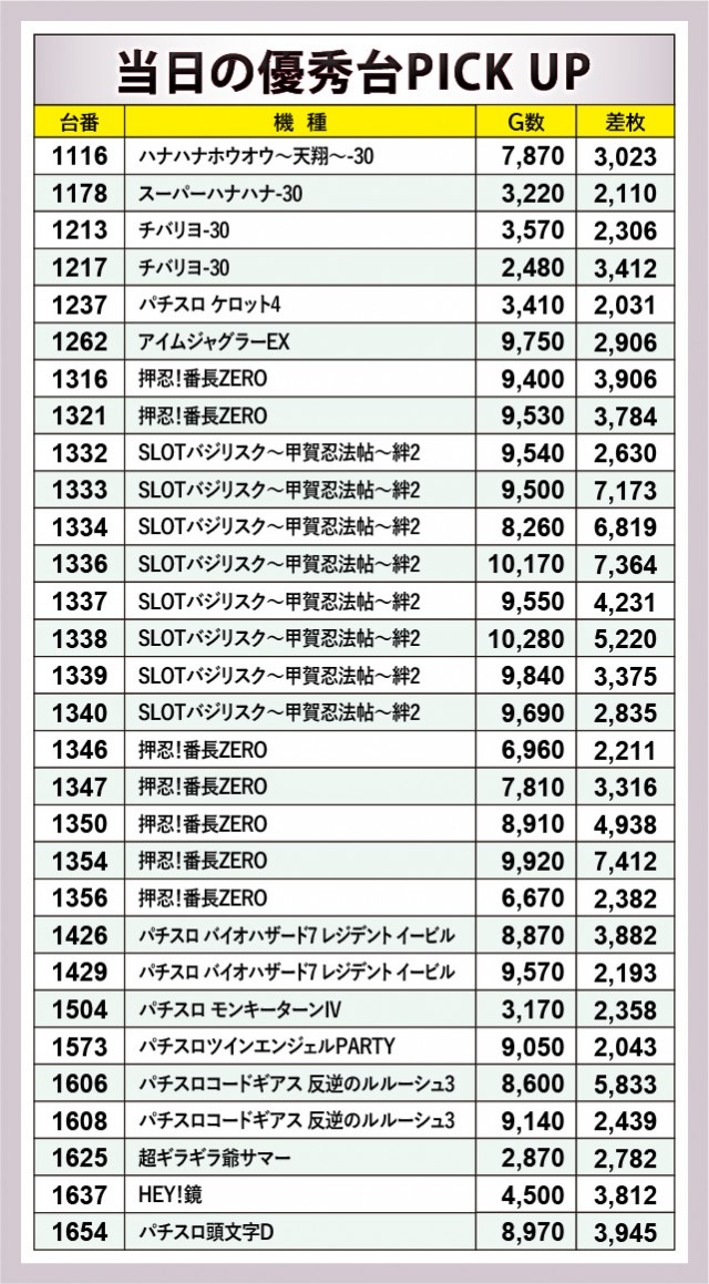 『SLOTバジリスク~甲賀忍法帖~絆2』は全台大きな盛り上がりとなっており、それは消化されたゲーム数と差枚数を見れば一目瞭然だろう。1336番台では10,170G・7,173枚といった突出した記録が発生しており、ほかの台でも熱気を放つなど、ファンは有意義な時間を過ごしていたはずだ。『押忍!番長ZERO』も同様で、1354番台+7,412枚といった記録が見られ、人気機種がファンの期待に応えた格好だろう。