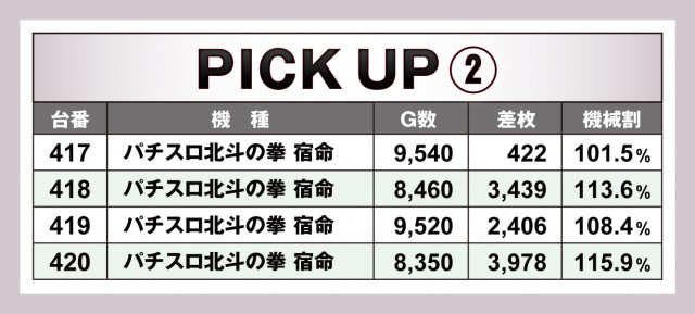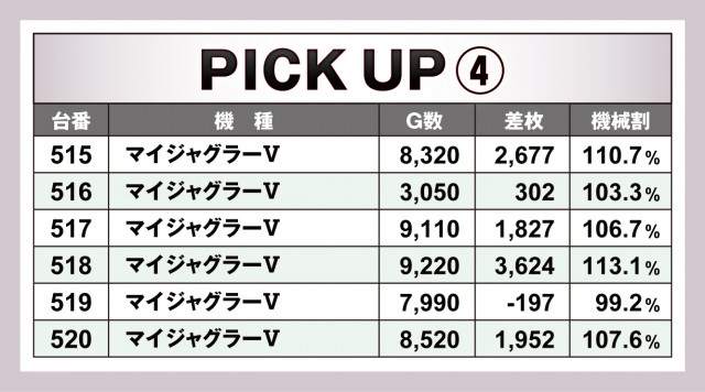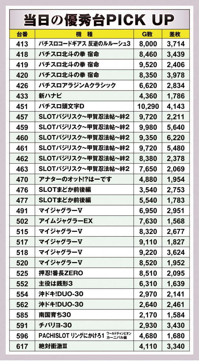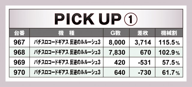 今回のピックアップは4箇所。バジに関しては1台を除いて全てプラスになっていることから、全台系であった可能性が高い。『パチスロ北斗の拳 宿命』に関しては全台プラス! 1台だけ不発気味だったが、こちらも全台系だったのだろうか。そう考えると『パチスロコードギアス 反逆のルルーシュ3』は満足に稼働をしていなかったことから、まだまだ可能性はあったと見ていいのではないだろうか。