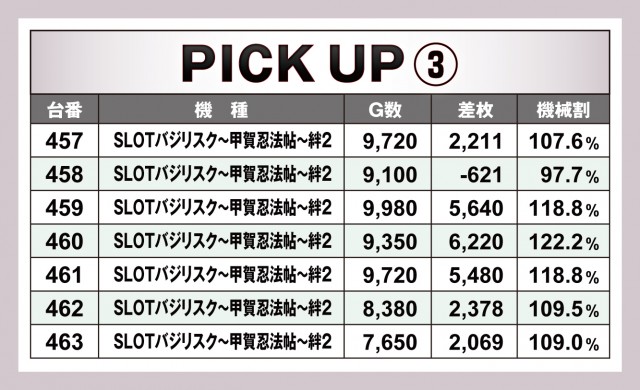 『アスワン幕張』のパチスロ総台数は212台。機種数はかなり豊富ということもあり、色んな機種から優秀台が飛び出てきた。その中でもやはりとりわけ人気が高い『SLOTバジリスク~甲賀忍法帖~絆2』と『マイジャグラーⅤ』はその数も多く、今回の取材の目玉だったと思われる。ただし、見所はそれだけでない! この後のピックアップでもご紹介していこう。