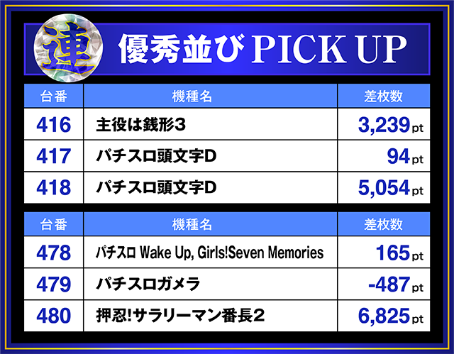416番台の「主役は銭形3」から418番台の「パチスロ頭文字D」までの3台にて、プレイヤーたちが活躍!