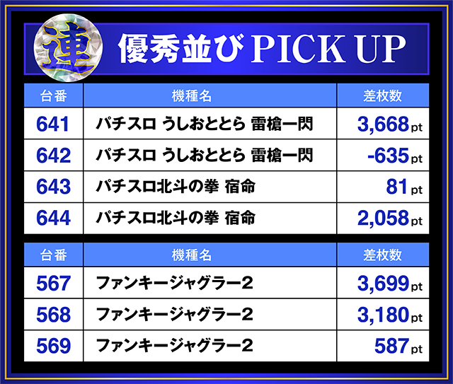 どの台も+1,000pt以上を記録し、508番台は+4,000ptオーバーと好結果を残した。