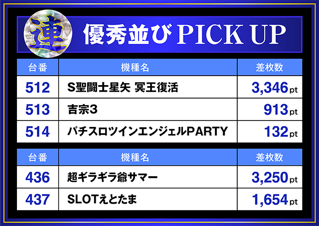 「S聖闘士星矢 冥王復活」の512番台から「パチスロツインエンジェルPARTY」の514番台までの3台が連なってプラス!!