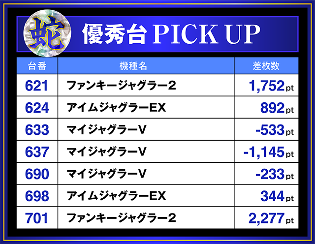 「ファンキージャグラー2」の701番台、「アイムジャグラーEX」の624番台、「マイジャグラーV」の633番台や637番台など、ジャグラーシリーズの全機種から、キラリと輝く要素を感じられたことが最大のポイント。