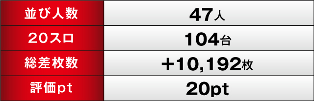 終わってみれば、トータルの差枚数は+10,192枚を記録。評価ptも20ptを獲得した。前回より差枚数こそ減ったが、評価ptが上がるという素晴らしい成績で、連勝をさらに伸ばしたのであった。