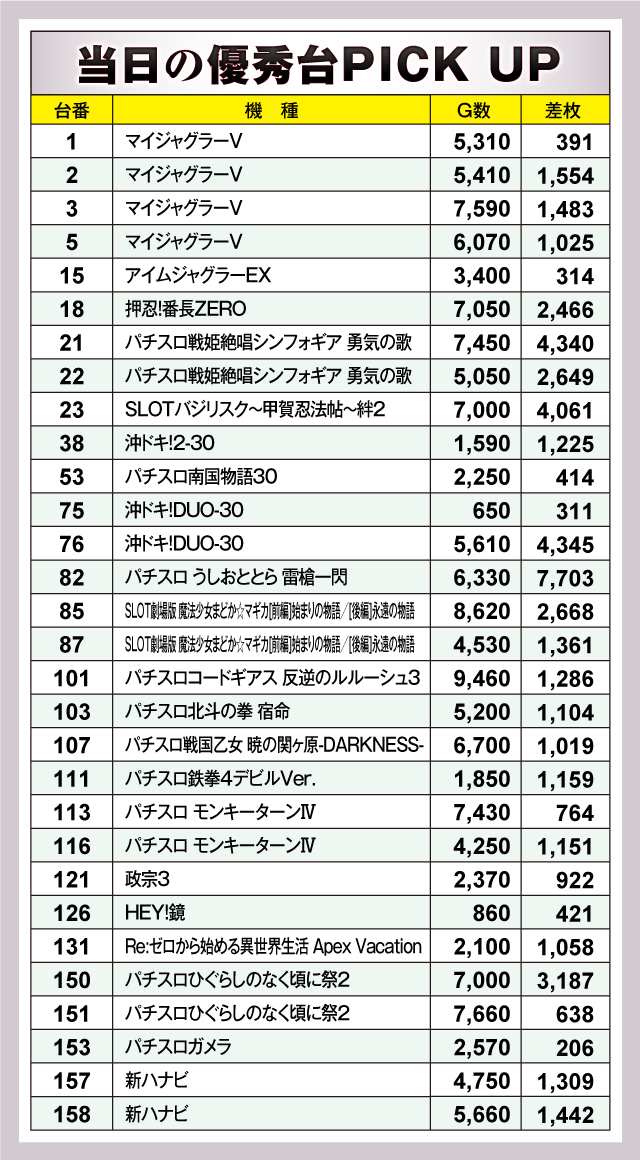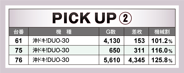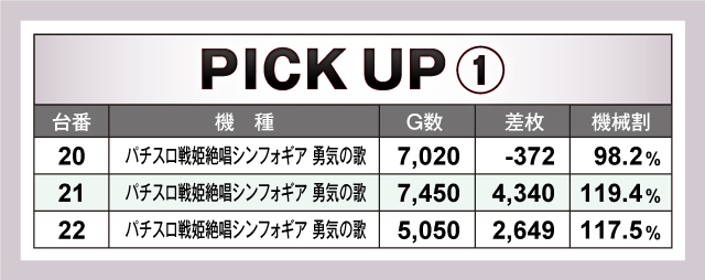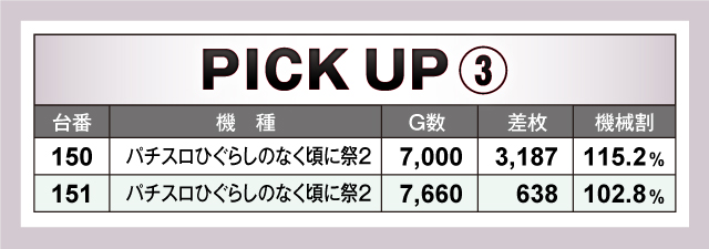 ピックアップ機種では、『パチスロ戦姫絶唱シンフォギア 勇気の歌』、『沖ドキ!DUO-30』、『パチスロひぐらしのなく頃に祭2』と、優秀台にも名を連ねた機種が、並びで活躍していた。