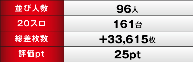 数多くの優秀台が出現した結果、総差枚数は+33,615枚を記録。評価ptも25ptと大勝利の1日となった。さすがは人気スロ専、実力の高さを大勢のファンに見せつけた結果となった。次の機会も要チェックだ!!