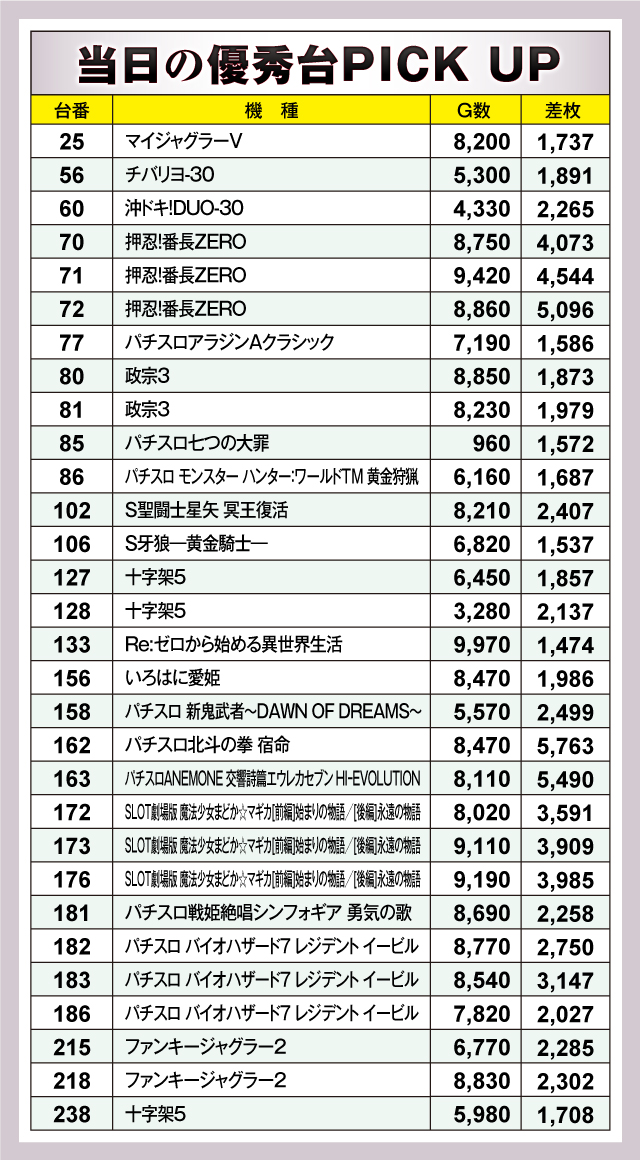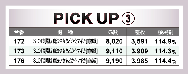 いずれも素晴らしい成績となっているが、特に『押忍!番長ZERO』はピックアップした台すべてが+4,000枚オーバー。『まどか☆マギカ[前後編]』は+3,000枚オーバーと、他を圧倒する実力を見せていた。
