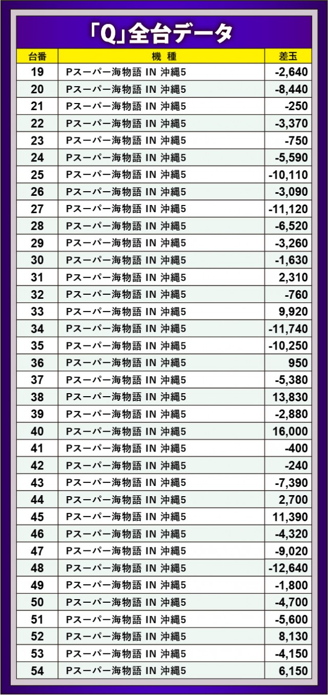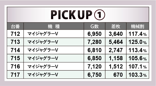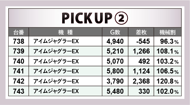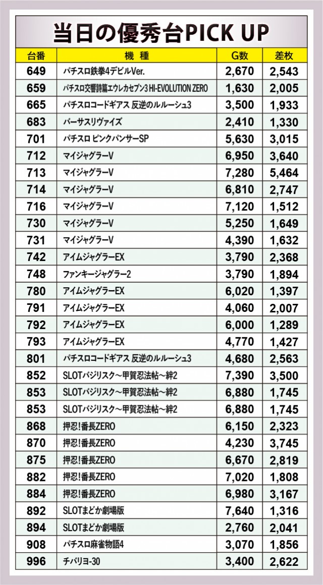 上表をご覧の通り、『マイジャグラーV』と『アイムジャグラーEX』、『SLOTバジリスク~甲賀忍法帖~絆2』と『押忍!番長ZERO』といった定番機種の活躍が目立っている。いずれも多くゲーム数が消化されるだけでなく、ノーマル機ながら713番台は+5,464枚という記録が発生した。AT機群も2~3千枚OVERが多発しており、熱気は申し分ないくらいに高かったことが分かる。