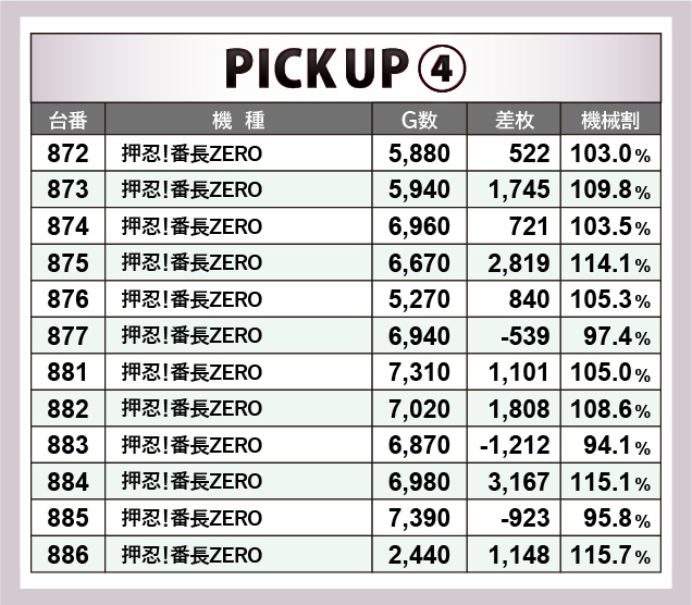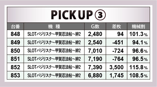 一方で『SLOTバジリスク~甲賀忍法帖~絆2』『押忍!番長ZERO』の2機種では、合計3ヶ所の好況スポットが見られた。特に目立っていたのは『押忍!番長ZERO』で、いずれもじっくりと打ち込まれたことが数字から窺えるだろう。2~3千枚OVERを達成する台も確認でき、遊技していたファンは打ちごたえのある状況に頬を緩めていたはずだ。