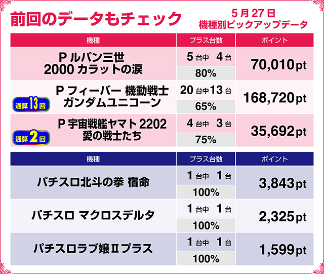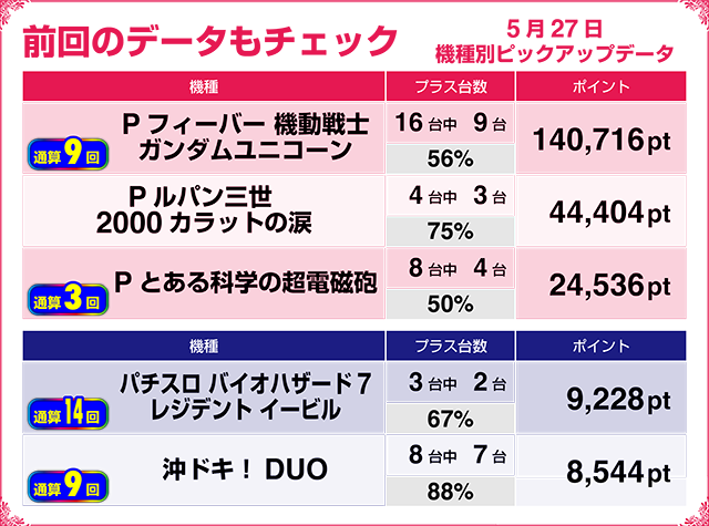 通算ピックアップ回数を更新している機種も多く、なかには歴代ランキングを塗り替えるほどの好調台もあった。