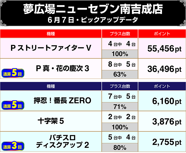 通算5回目の登場となる『P真・花の慶次3』と『押忍!番長ZERO』も好成績を残している。