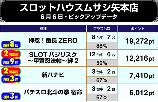 2店舗が7日にピックアップ台が並ぶなかで、スロットハウスムサシ矢本店は6月6日に魅力的なデータが多数。