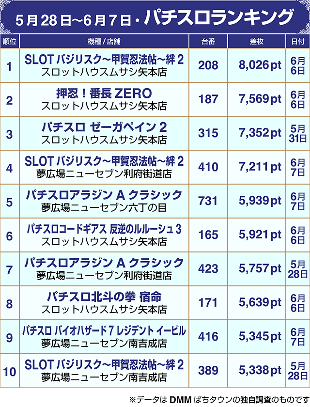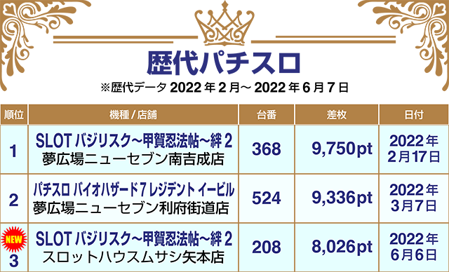 『SLOTバジリスク~甲賀忍法帖~絆2』の1台が、歴代ランキングをも塗り替える+8,000ptオーバーをを記録した。
