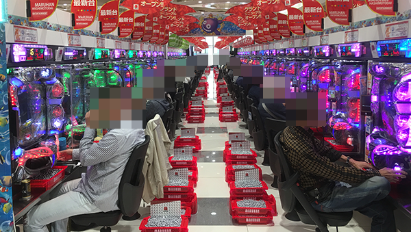 14時頃の4円パチンコをみると、「ぱちんこCR真・北斗無双」の盛り上がりが大きく、満足といった表情で遊技をおこなうプレイヤーも多数。