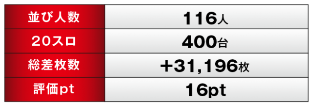 今回の[1000円/46枚] スロ計400台ではトータル差枚数+31,196枚と前回には一歩及ばずだったが、それでも素晴らしい勝利となった! さらに評価ptは16ptとこちらも好成績に終わった。ぜひこの勢いのまま次回取材時でも華々しい勝利をもぎ取ってほしい!