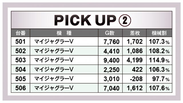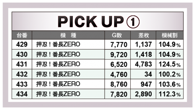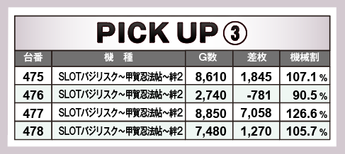 またこの日は3箇所計16台の横並び好況スポットが出現。差枚数+4千枚を筆頭に6台並びで全台プラス差枚を達成した『押忍!番長ZERO』。それに負けじとボーナスタイプの『マイジャグラーⅤ』でも大量出玉の並びを発見!更に今回差玉トップで7千枚越えを記録した477番台を含めた横並び『SLOTバジリスク~甲賀忍法帖~絆2』が目立った形となった。