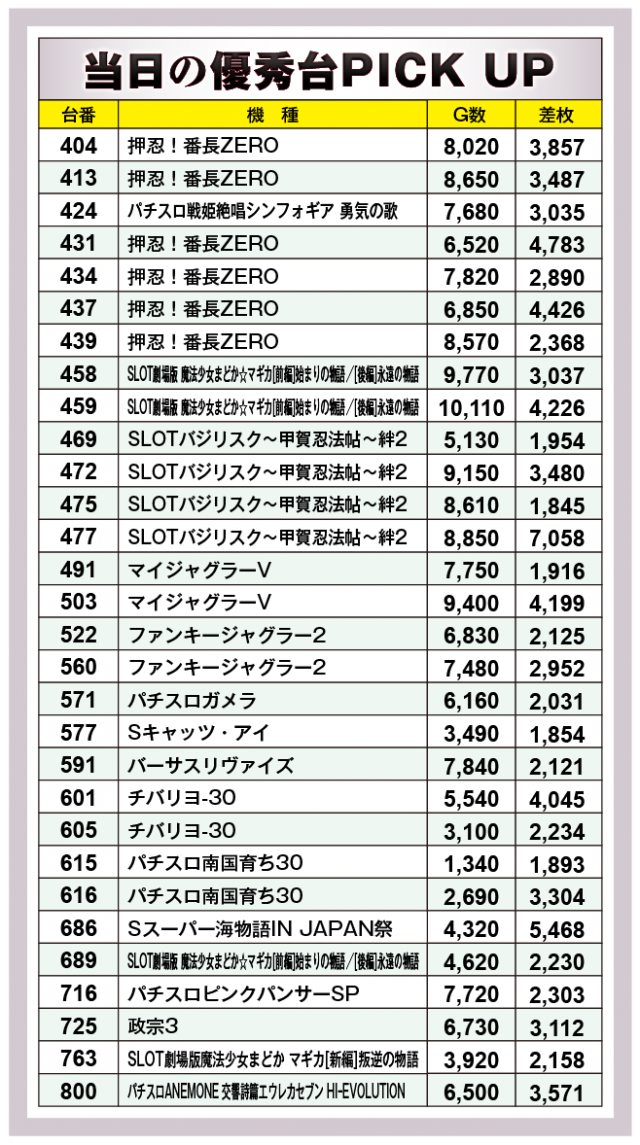 まずは優秀30台のPICK UPをチェック。4台を除く26台が差枚数+2千枚オーバー、うち8台が+3千枚オーバー、+4千枚オーバーを達成したのは7台だった。また、後述する横並び好況スポット以外では+5千枚オーバーを叩き出した『Sスーパー海物語IN JAPAN祭』を始め、2台並び含む合計3台で+9千枚オーバーを記録した『SLOT劇場版 魔法少女まどか☆マギカ[前編]始まりの物語/[後編]永遠の物語』が一際輝きを放っていた。
