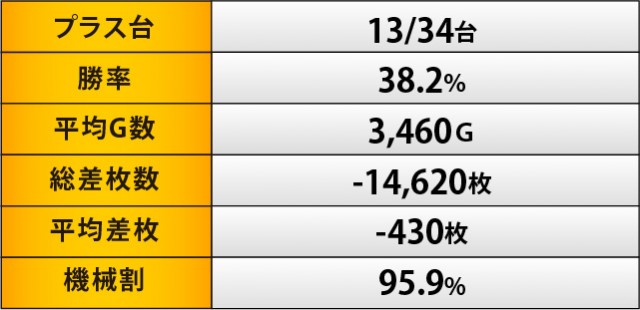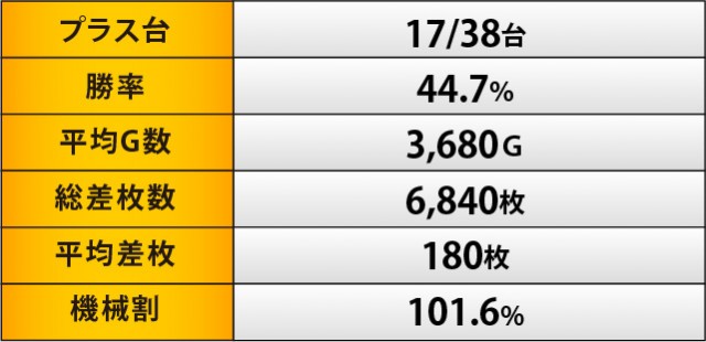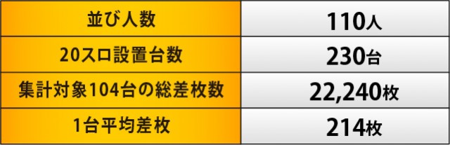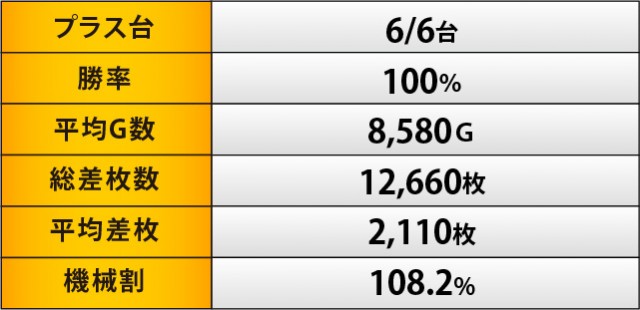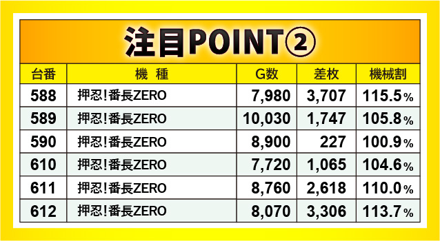 この日のMVPは『押忍!番長ZERO』に他ならない。全台プラス差枚数を記録するだけでなく、3千枚OVERが2台飛び出すという盛況ぶりを披露していた。平均差枚数も圧巻の+2,110枚となっており、ドル箱に手が伸びるだけでなく別積みまで発生する状況に、ファンは頬を緩めていたはずだ