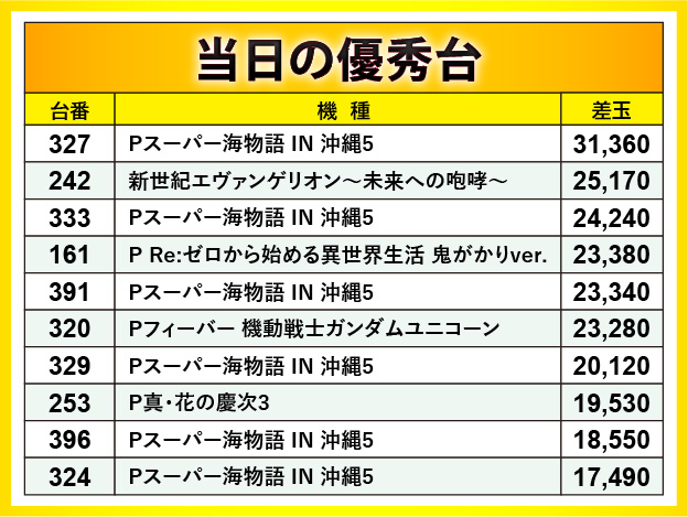 猛暑が辛くなる時期だが、『Pスーパー海物語 IN 沖縄5』の活躍はそれ以上に夏の本番がやってきたことを予感させるばかりだ。327番台にて+31,360玉が記録されれば、他の台でも2万発OVERが多く発生していたのが印象的。