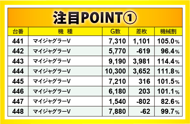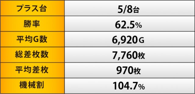 『マイジャグラーV』は『ジャグラー』シリーズの盛り上がりを牽引する存在となっており、各所でコンスタントなボーナス当選を確認できた。半数以上が勝利を収め、平均差枚数も千枚に近づく熱気を放っており、打ちごたえのある状況にファンは満足感を覚えたに違いない。