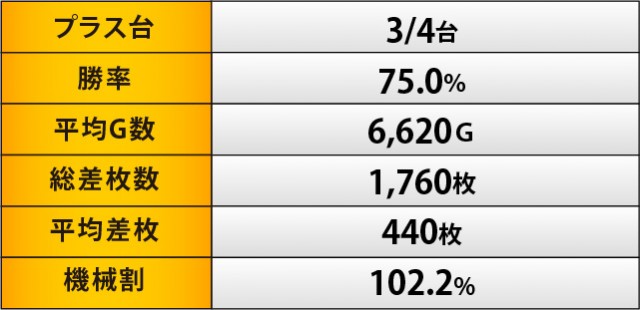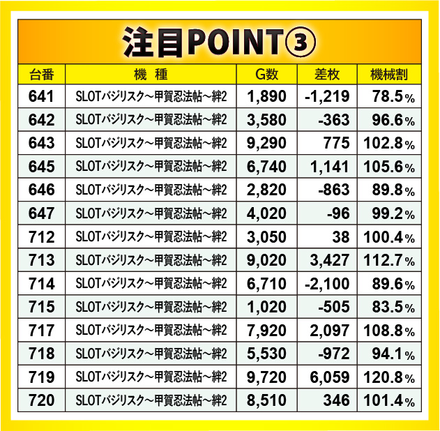 719番台+6,059枚という鮮烈な記録を残したのが『SLOTバジリスク~甲賀忍法帖~絆2』だった。人気機種らしい盛り上がりを披露し、勝率50%という優秀な結果を残してくれた存在だ。レバーを力強く叩ける環境が整えられており、それは遊技していたファンがよく理解していたのではないだろうか。